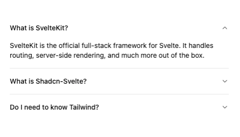 Notice the import * as Accordion pattern — Shadcn-Svelte components are often made up of multiple sub-components (Root, Item, Trigger, Content) that work together. This composable structure gives you full control over the markup and makes it easy to slot in your own content.